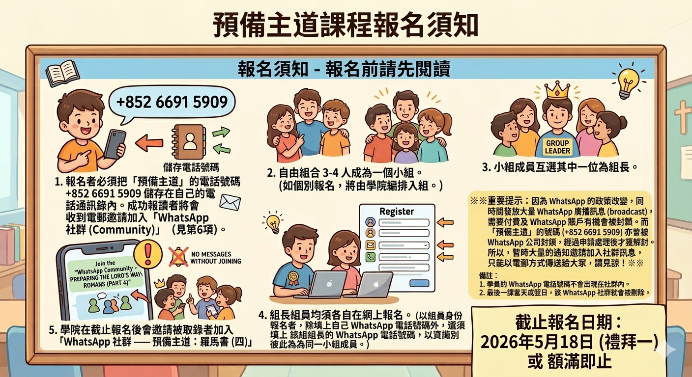 - 報名者必須把「預備主道」的電話號碼 +852 6691 5909 儲存在自己的電話通訊錄內,成功報讀者將會收到 電郵 邀請加入「whatsapp社群(Community)」(見下面第6項)