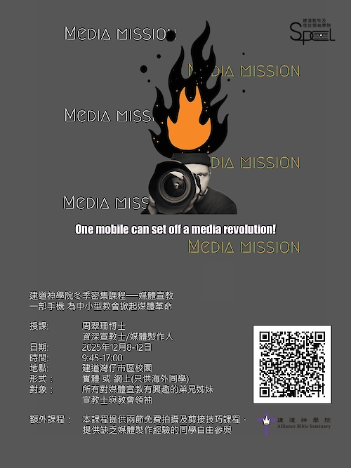 課程將教授媒體宣教的神學和理論,媒體在新事工開展、崇拜更新、佈道的應用,介紹不同社交平台、大眾傳播概論、傳媒道德等注意意項。