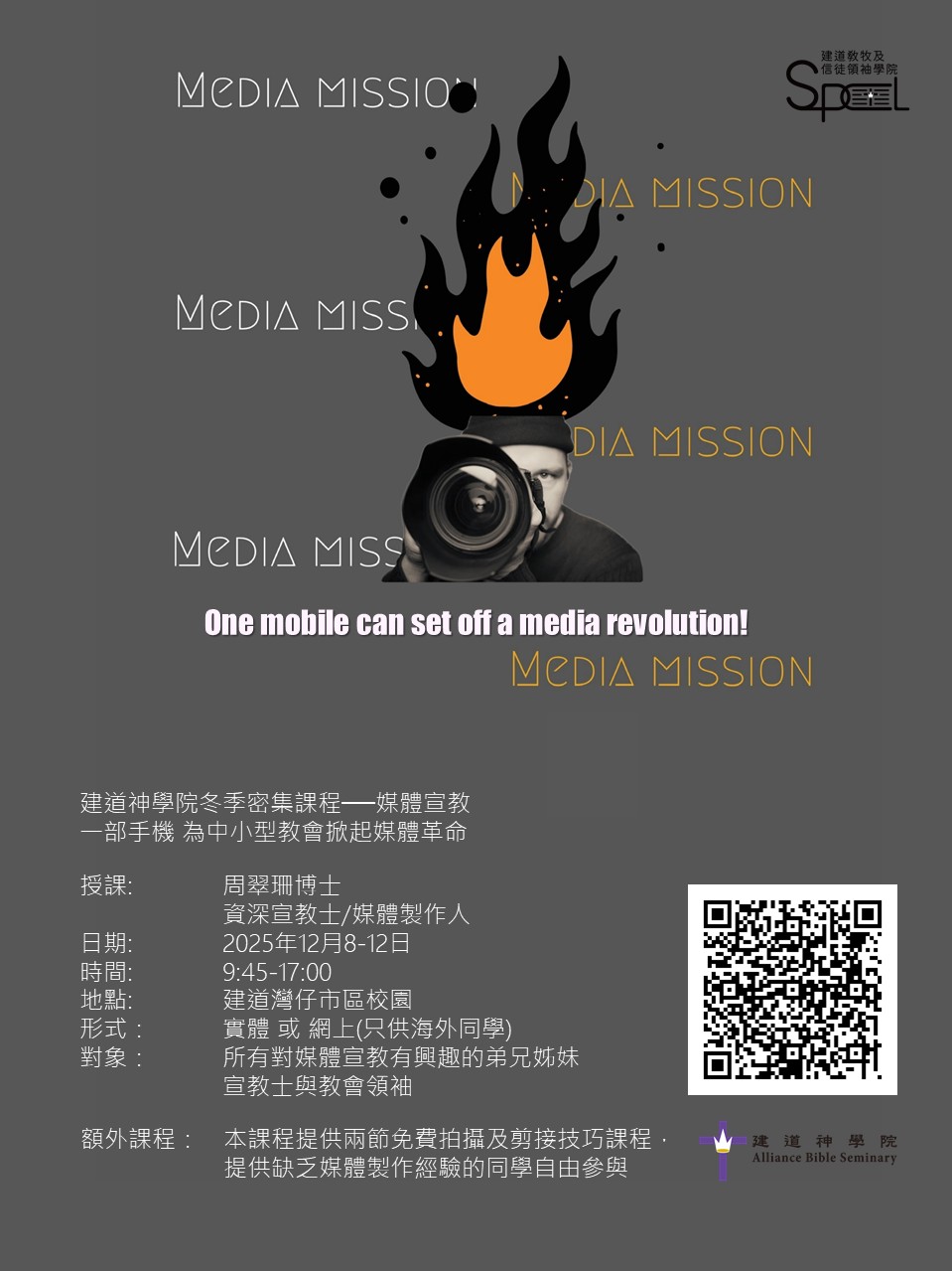 課程將教授媒體宣教的神學和理論,媒體在新事工開展、崇拜更新、佈道的應用,介紹不同社交平台、大眾傳播概論、傳媒道德等注意意項。