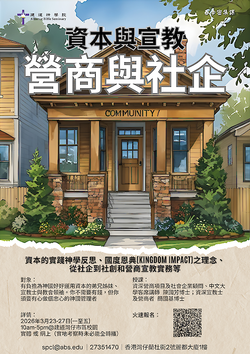 詳情: 2026年3月23-27日(一至五) 10am-5pm@建道灣仔市區校園 實體 或 網上(實地考察時未必能全轉播)