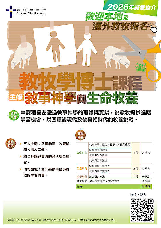 本課程旨在透過敘事神學的理論與實踐,為教牧提供進階學習機會,以回應後現代及後真相時代的牧養挑戰。課程著重深化牧者的神學思維與生命牧養能力,幫助教牧在講壇事奉、個人牧養及事工實踐中,有效塑造信徒的屬靈生命,引導信徒以基督為中心,建立清晰的身分認同,經歷持續的生命更新。
