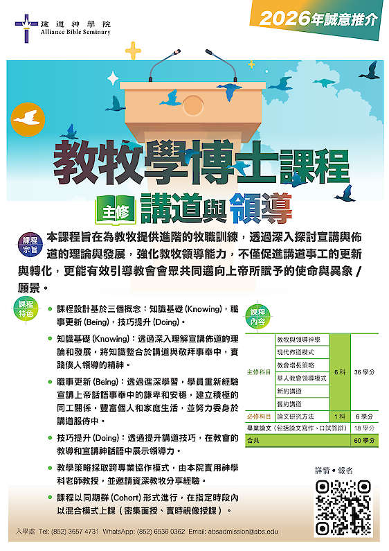 本課程旨在為教牧提供進階的牧職訓練,透過深入探討宣講與佈道的理論與發展,強化教牧領導能力,不僅促進講道事工的更新與轉化,更能有效引導教會會眾共同邁向上帝所賦予的使命與異象/願景。