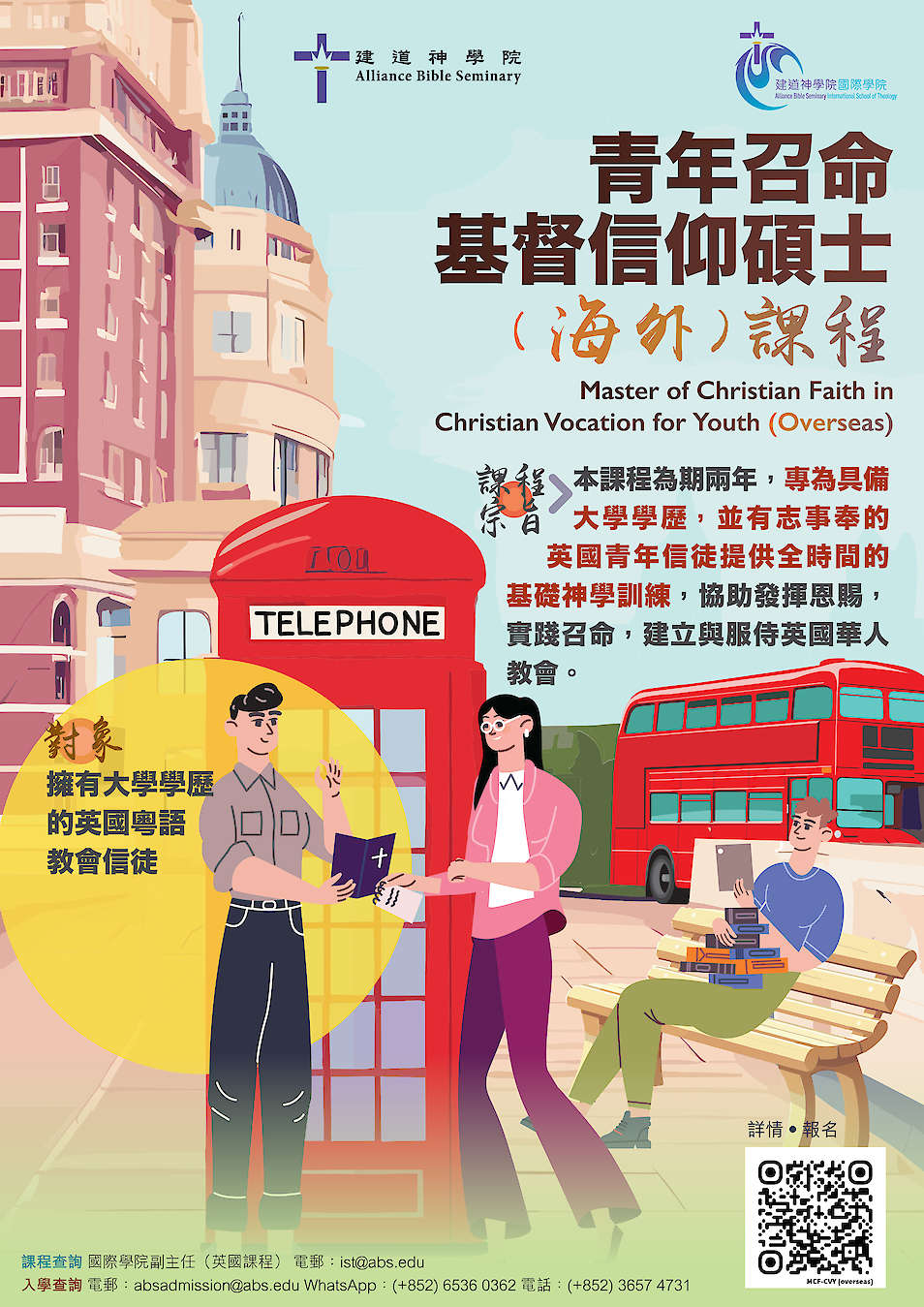 本課程為期兩年, 專為具備大學學歷,並有志事奉的英國青年信徒提供全時間的基礎神學訓練,協助發揮恩賜,實踐召命,建立與服侍英國華人教會。
